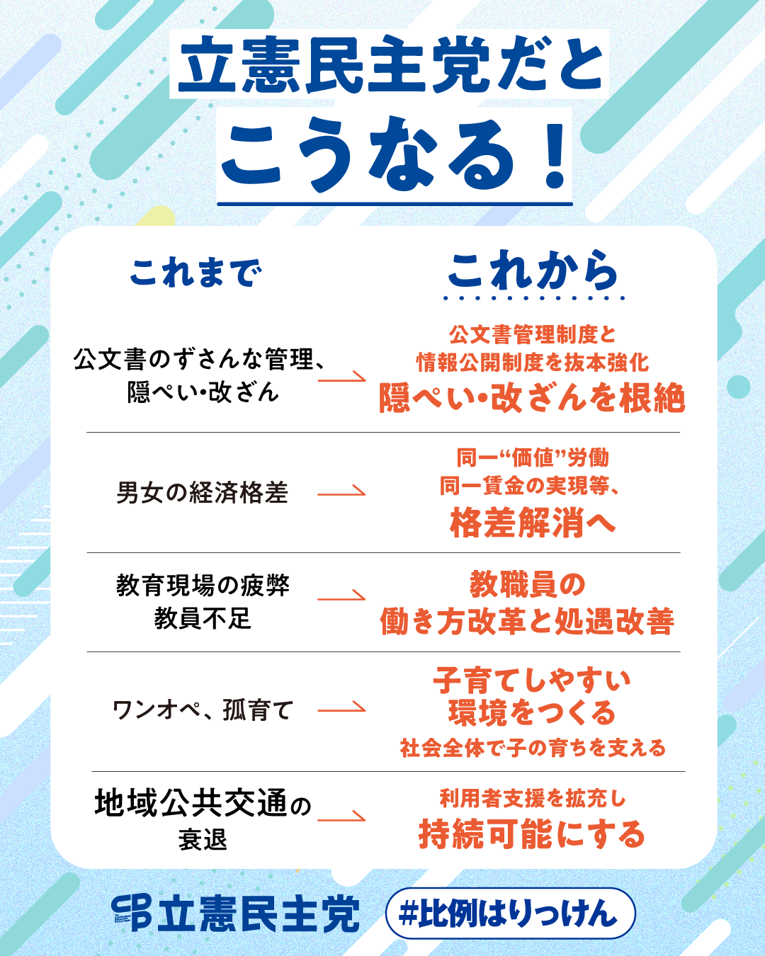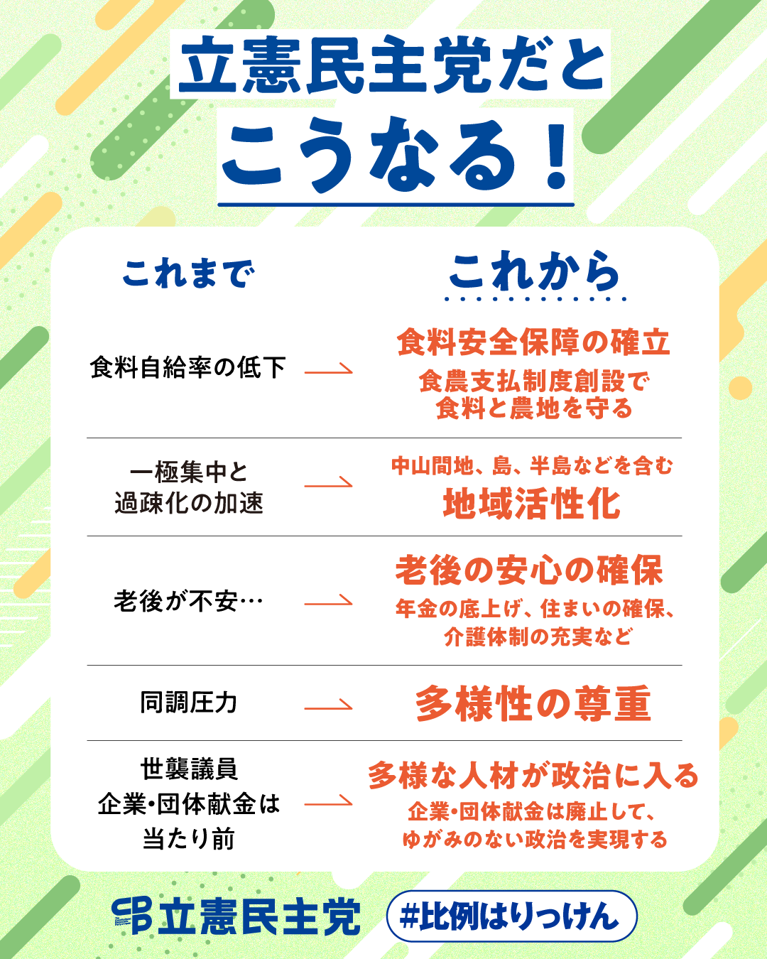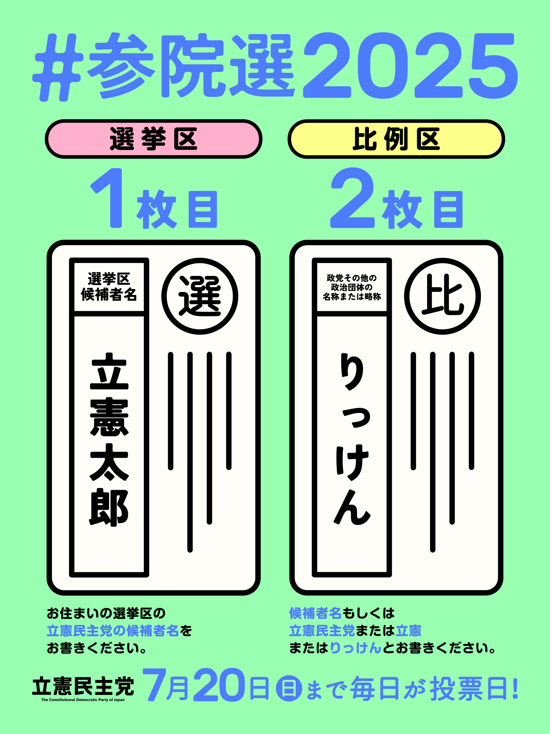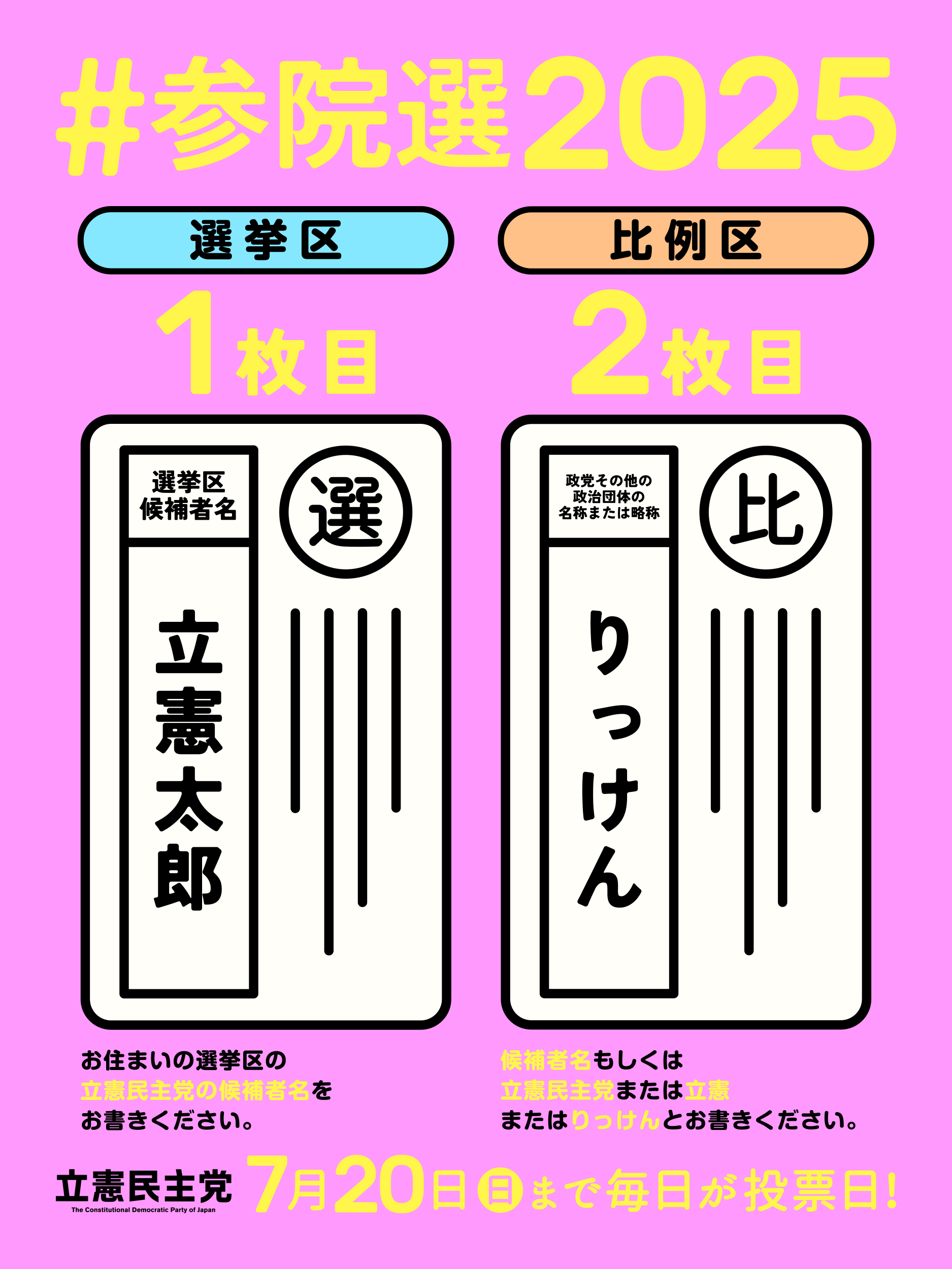 SNSを通して、ひとりでも多くの人に立憲民主党の候補者や活動を知ってもらうために、気になるコンテンツを拡散しよう。 なぜ立憲民主党を応援するのか、あなたの気持ちも添えて送ると思いが伝わります。