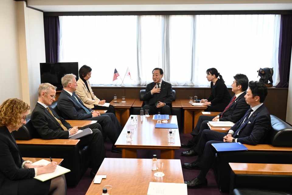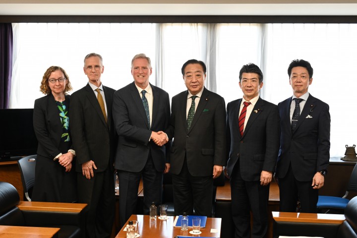 野田佳彦代表は4月15日、党本部でジョセフ・マイケル・ヤング米国臨時代理大使と会談しました。会談には、重徳和彦政務調査会長(党日米通商問題対策本部本部長)、源馬謙太郎国際局長が同席しました。
