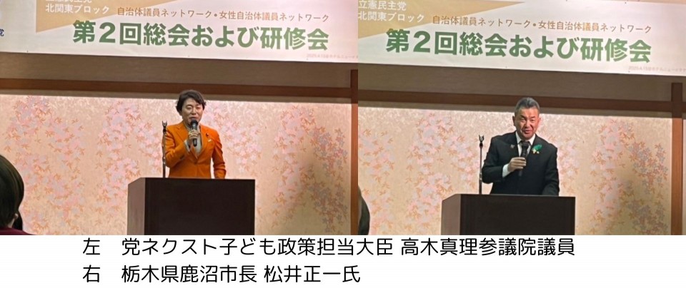 総会後、自治体議員NWの仲間から参議院議員になった、党ネクスト子ども政策担当大臣の高木真理議員と、栃木県鹿沼市の松井正一市長が講演し、活発な意見交換が行われました。