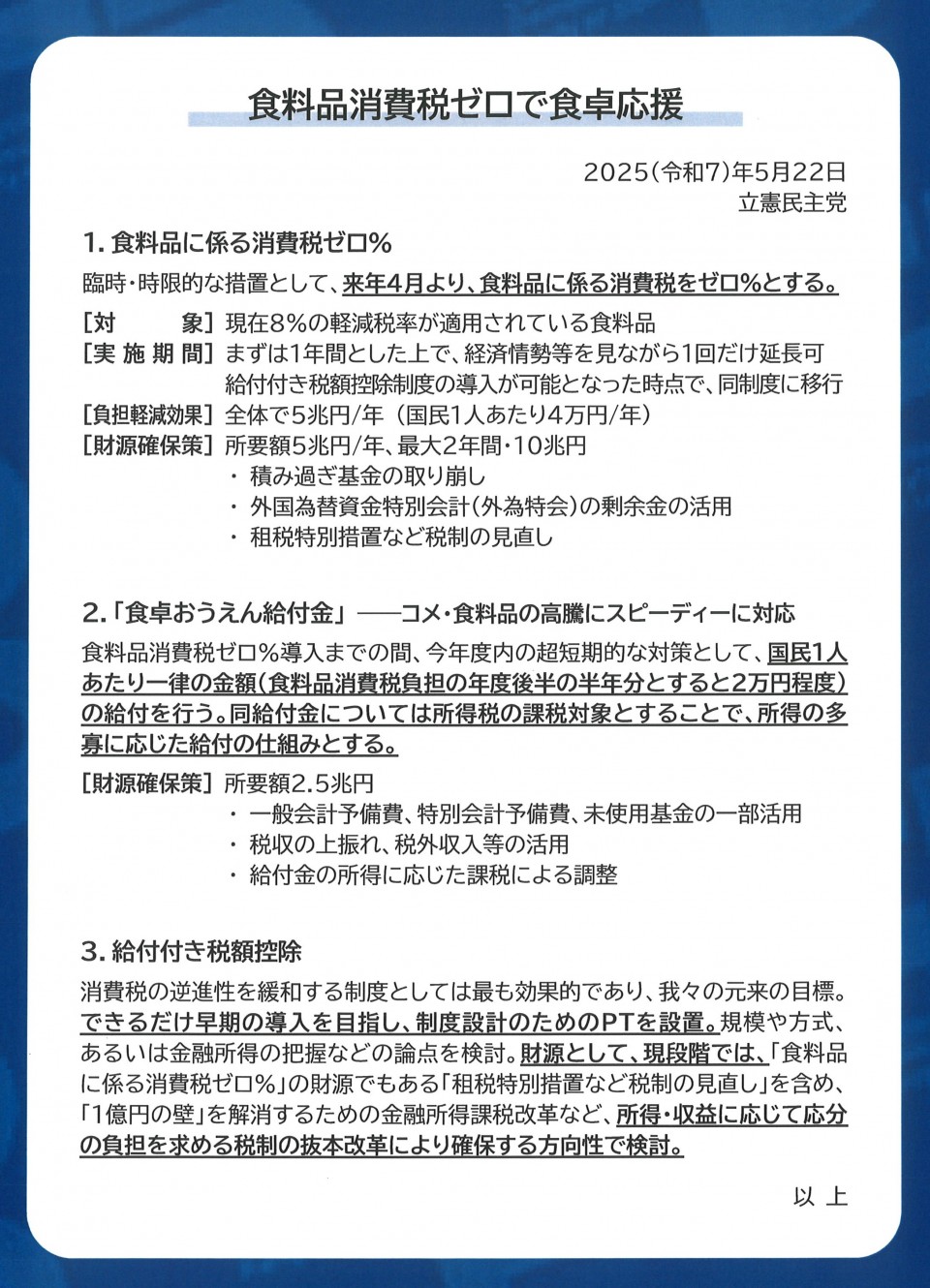目指すは給付付き税額控除、臨時時限的な措置として消費税ゼロ%の導入、その前の超短期的な対策、いずれも財源を明示して制度設計をしてまいります。