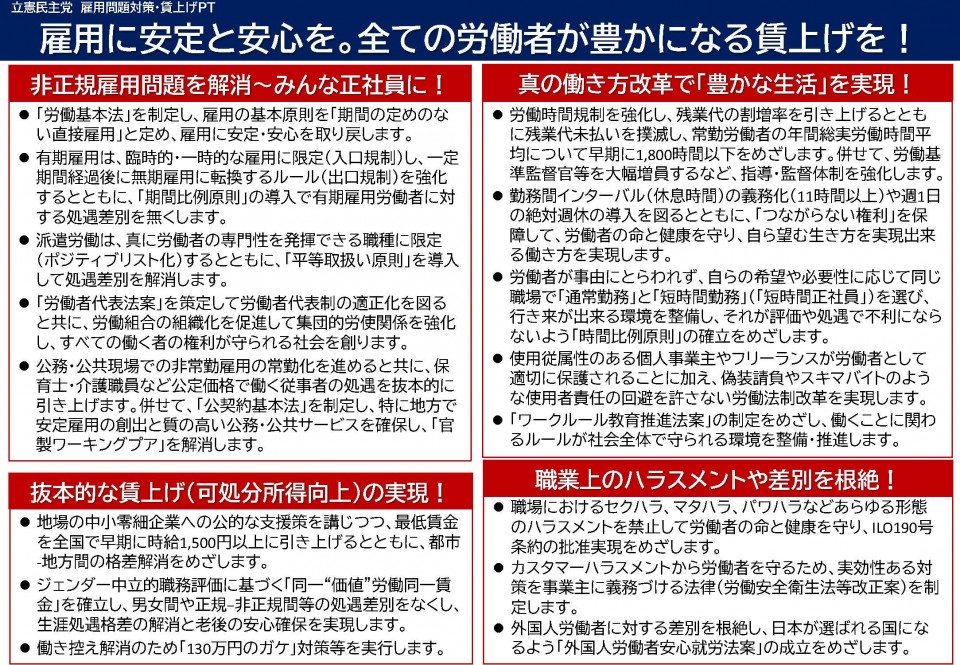 立憲民主党の雇用問題対策賃上げPTが取りまとめた政策について、PT事務局長の石橋通宏参院議員が内容を説明しました。本政策は、「雇用に安全と安心を。全ての労働者が豊かになる賃上げを!」と題し、(1)非正規雇用問題を解消~みんな正社員に!(2)真の働き方改革で「豊かな生活」を実現(3)抜本的な賃上げ(可処分所得向上)の実現!(4)商業上のハラスメントや差別を根絶!――の4つを柱としたもの。石橋参院議員はこれらトータルでの実現を目指すことにより、「全ての方々が普通に働いて普通に暮らし、安心して家族を持っていただけることが当たり前の日本社会にしたい」と力を込めました。重徳政調会長は、党が志す労働法制改革について、90年代からの流れを大きく変えることになるため「私たちの政権をもってしか変えられない。政治的エネルギーが必要な改革だ」と強調しました。