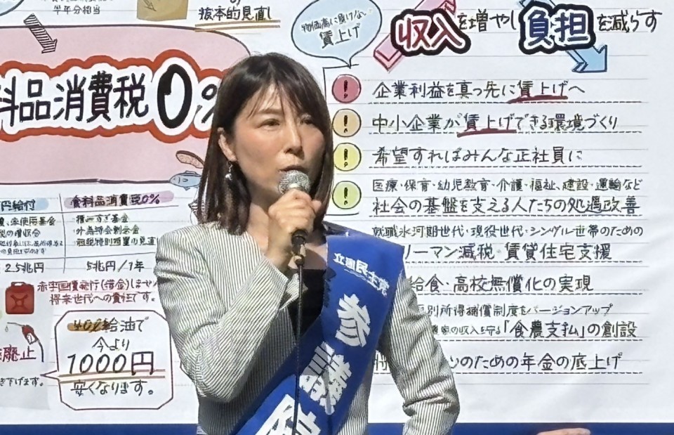 野田代表は、総理大臣在任時に、「社会保障と税の一体改革」を打ち出し消費税増税の道筋をつけた実績がありますが、今回は「物価上昇にあえぐ国民の声を受け止めた、苦渋の政治決断だ」と食料品消費税0%を打ち出しました。「民の竈(かまど)から煙が上がらなくなったら、政治が動くしかない」と述べ、財源は赤字国債に頼ることなく、積みすぎた基金の取り崩しや外為特会(外国為替資金特別会計)の剰余金の活用、不透明な租税特別措置など税制の見直しなどから確保することを説明しました。