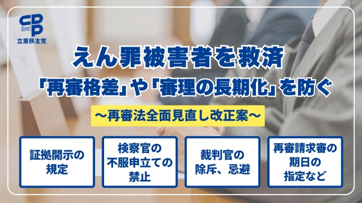 立憲民主党は6月18日、「再審法改正案」(正式名称:刑事訴訟法の一部を改正する法律案)を国民民主党、れいわ新選組、日本共産党、参政党、社会民主党との6党共同で衆院に提出しました。