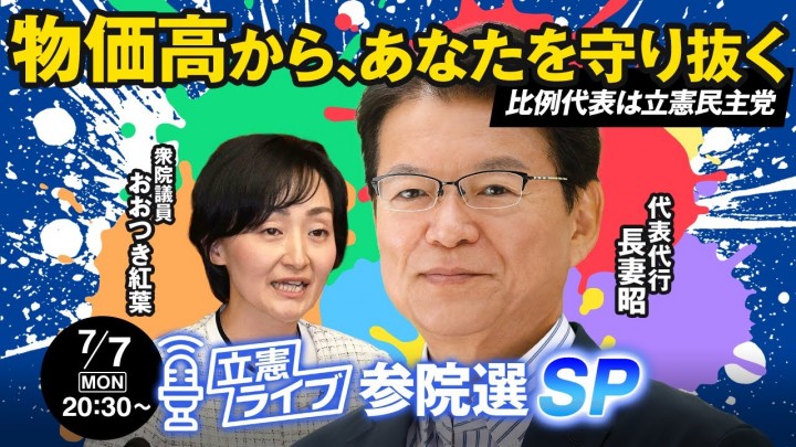 参院選5日目である7月7日、「立憲ライブ」をスペシャル配信します。長妻昭代表代行を迎え、お話します。ぜひ、ご覧ください。