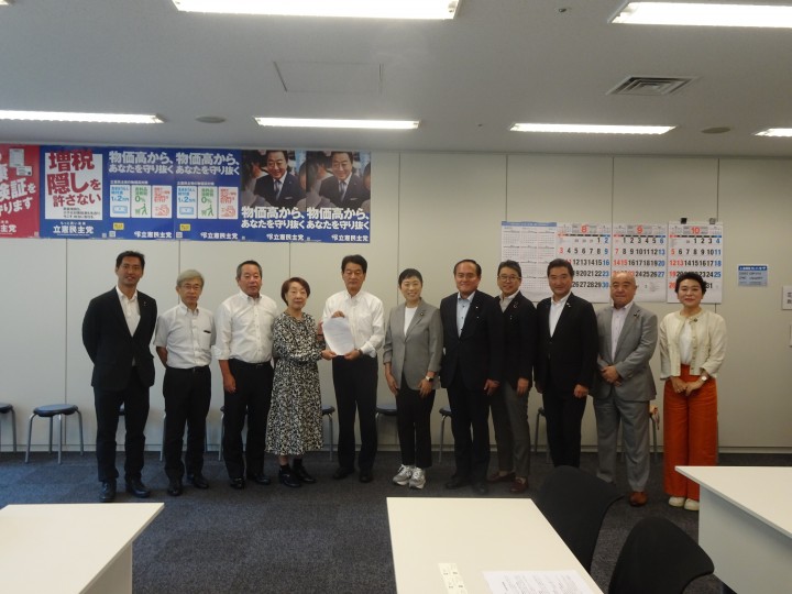 要請には7月16日の日本退職者連合の定期総会に党を代表して来賓として出席した辻元清美代表代行を筆頭に、大島敦企業・団体交流委員長、高木真理議員の他、落合貴之・下野幸助・辻英之・升田世喜男各衆院議員、鬼木誠・岸真紀子・柴愼一・吉田忠智各参院議員らが出席し、闊達な意見交換を行いました。
