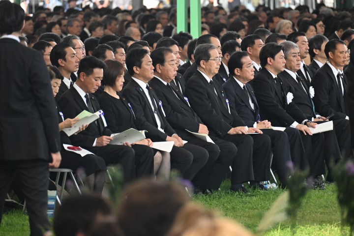 野田佳彦代表は8月6日、被爆から80年を迎える平和記念公園(広島市)で開催された「広島市原爆死没者慰霊式並びに平和祈念式(平和記念式典)」に参列しました。米国による原爆投下時刻の午前8時15分に黙とうし、一日も早い核廃絶と世界の恒久平和の実現を誓いました。式典後、「動員学徒慰霊塔」を東克哉衆院議員、森本真治参院議員らとともに訪れ、献花しました。