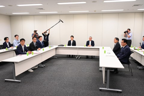 重徳和彦政務調査会長は9月3日、国会内で地方六団体(※)から「いわゆる『ガソリンの暫定税率』廃止に関する緊急提言」を受け取り、意見交換を行いました。