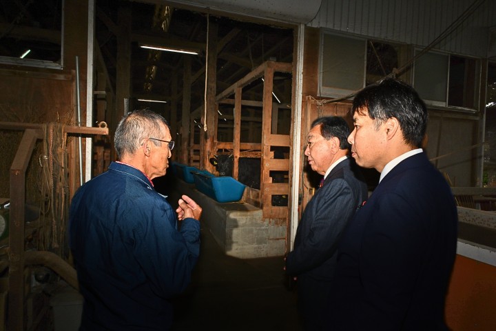 野田代表は山形市内の畜産農家を視察しました。今回訪問した農家は畜産業に携わって56年になるベテランで、長年の経験をもとに現場の実情を教えていただきました。
