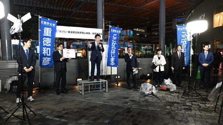 立憲民主党は11月25日、ガソリン税の暫定税率を12月31日に廃止する法案が本日衆議院で通過したことを受け、有楽町駅前で「ガソリン・軽油暫定税率廃止実現」と題した街頭演説会を行いました。演説会には重徳和彦税制調査会長をはじめ、道下大樹、髙松智之、松尾明弘、松下玲子、鈴木岳幸の各衆院議員が参加し、司会は松田功衆院議員が務めました。今回の街頭演説は、立憲民主党が展開する「ここからはじまる―聞く・つなぐ・変える―」全国キャンペーンの一環であり、暫定税率廃止への意見をはじめ、政治に対する期待や要望を聞く街頭アンケートも実施しました。