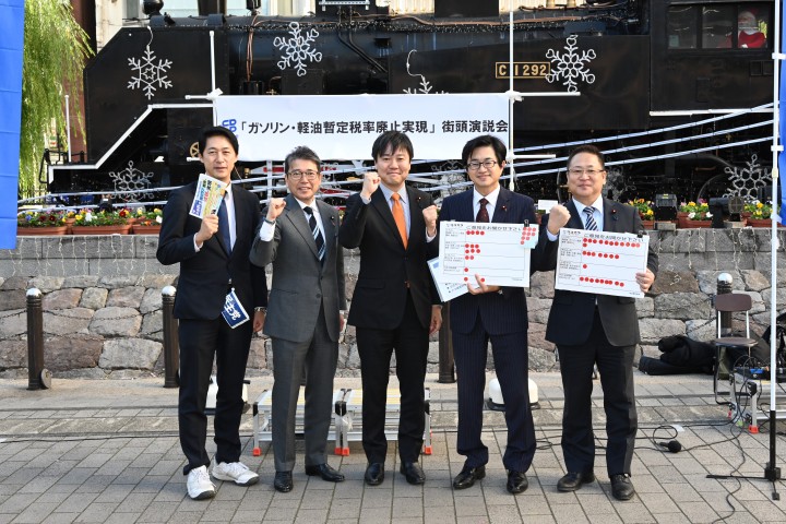 立憲民主党は東京都・JR新橋駅前で11月28日、全国キャンペーン「ここからはじまる―聞く・つなぐ・変える―」の一環として「ガソリン・軽油暫定税率廃止実現」街頭演説会を開催。同日午前の参院本会議でガソリン税の暫定税率を廃止法案が全会一致で可決・成立したことを受け、国民の皆さんと共に政治を動かすことができたと訴えました。