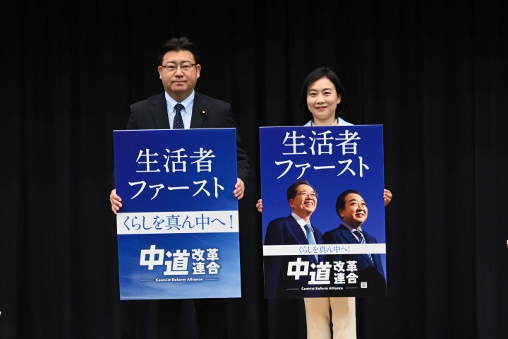 中道改革連合は1月20日、国会内で記者会見を開き、新しい政治活動用ポスターを発表しました。会見には、立憲民主党の広報委員長を務める渡辺創衆院議員と、公明党の広報委員を務める大森江里子衆院議員が出席しました。