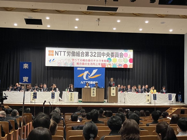 春闘方針を確認するため、NTT東西、ドコモ、NTTデータなどNTTグループ各社の労働組合で構成するNTT労働組合(略称:NTT労組、十川雅之中央執行委員長、組合員約14万人)の第32回中央委員会が2月13日、都内で開催され、来賓として立憲民主党の水岡俊一代表らが出席しました。
