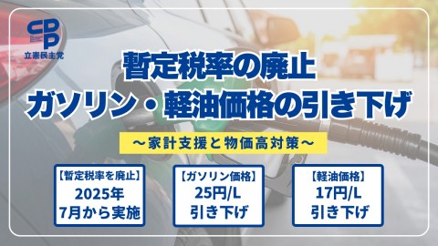 原油高騰の中、国民生活と国民経済を守るため、ガソリン等の価格が一定の水準に高騰した場合に揮発油税を引き下げる「トリガー条項」を一時的に発動し、ガソリン・軽油価格の高騰に歯止めをかける。 2021/12/7